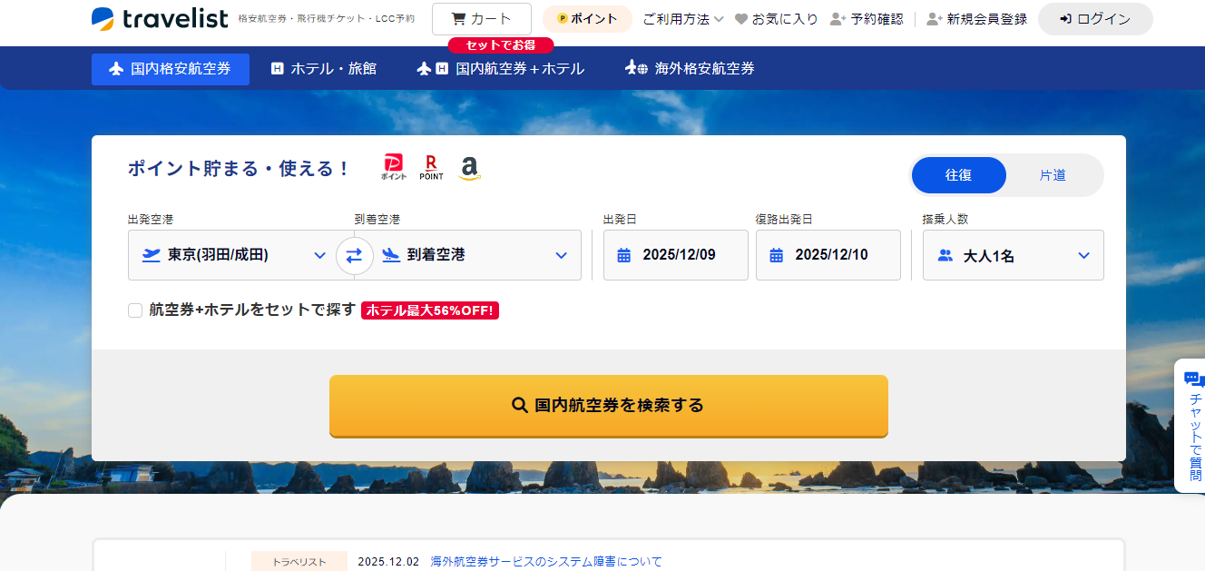 「トラベリスト」は、国内の格安航空券やLCCをまとめて比較・予約できる便利なサービスです。