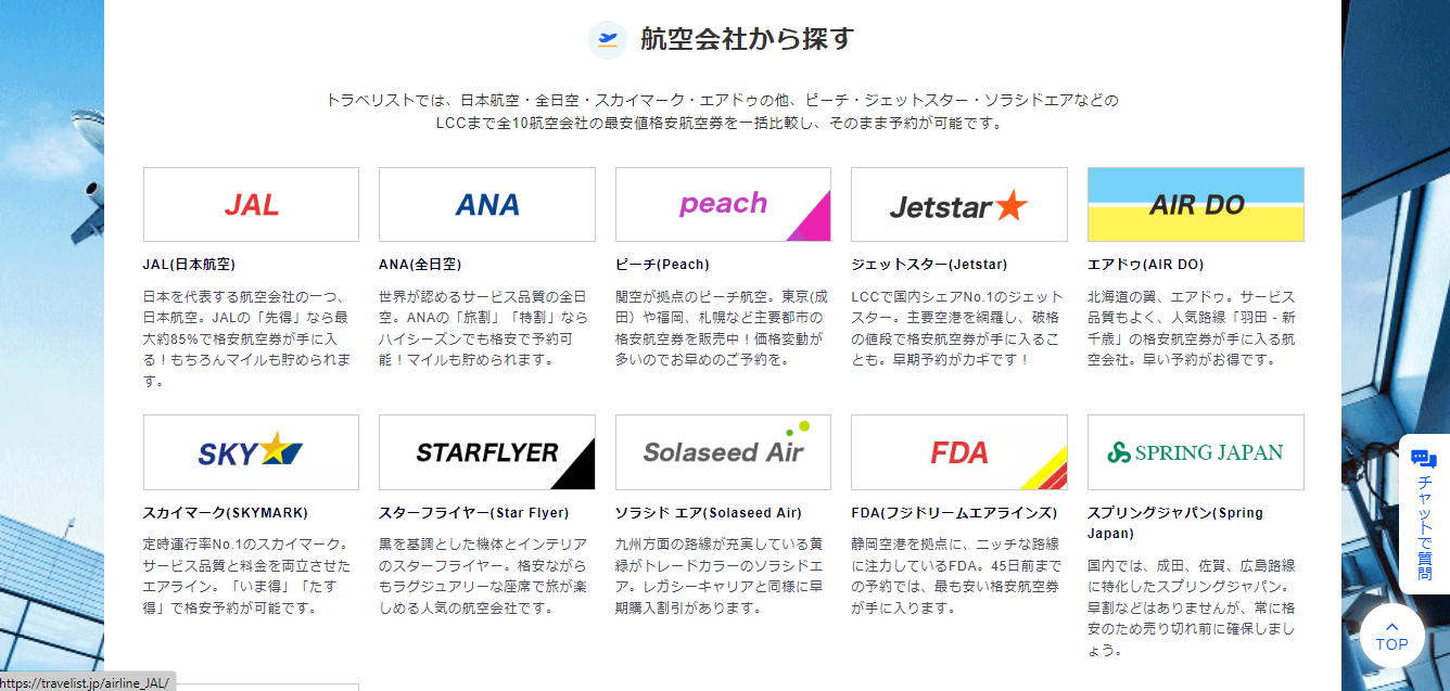 トラベリストの最大の特徴は、大手航空会社(ANA・JALなど)からLCC(Peach・Jetstar・スカイマークなど)まで、国内の航空券をまとめて比較できる点です。