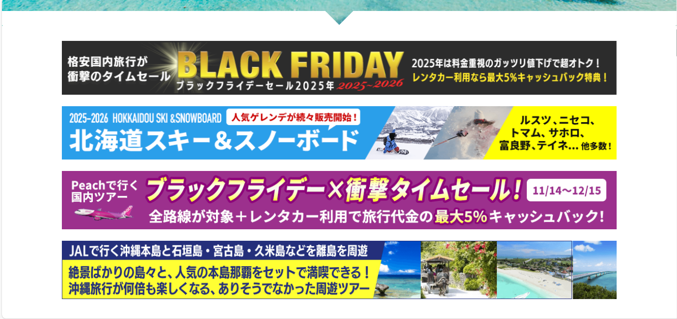 - 豊富なプラン選択:国内旅行は北海道から九州まで幅広く、沖縄旅行も本島から離島まで多彩なプランを用意。家族旅行、カップル旅行、ひとり旅まで、目的に応じたプランを選べます。