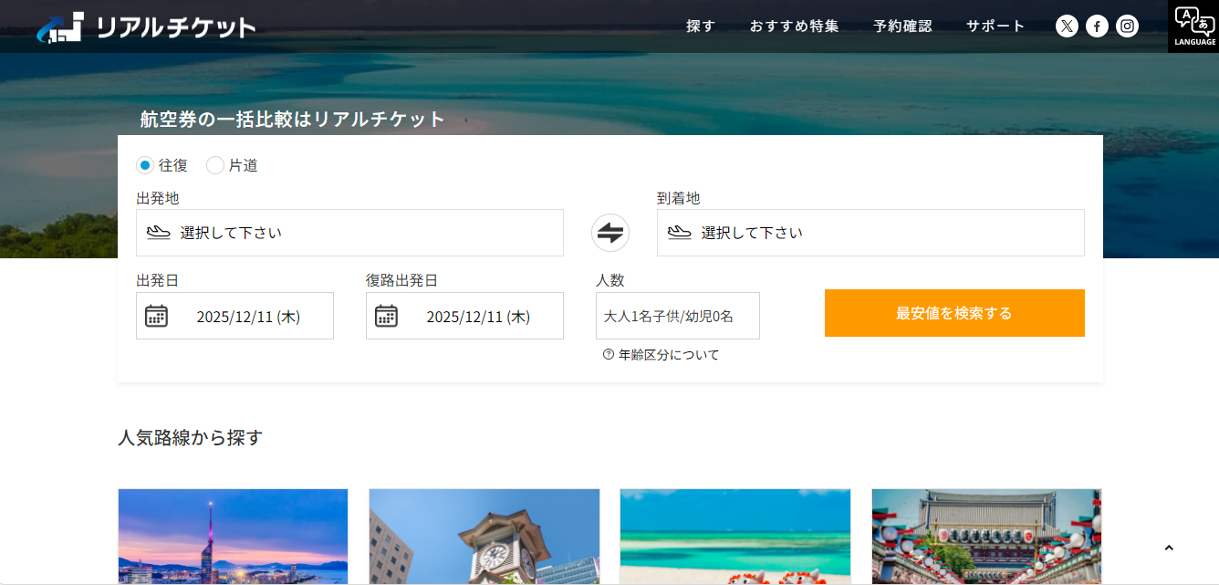 リアルチケットは、国内航空券を最安値で手間なく検索・予約・購入できる便利なサービスです。24時間365日いつでも利用でき、複数航空会社の料金を比較できるので、最もお得なフライトを簡単に見つけられます。出張や旅行、帰省など、あらゆる場面で活用できるため、航空券を購入するならぜひ検討したいサービスです。忙しい日常の中でも、安心・便利に航空券を手配できるリアルチケットで、快適な国内旅行を実現しましょう。