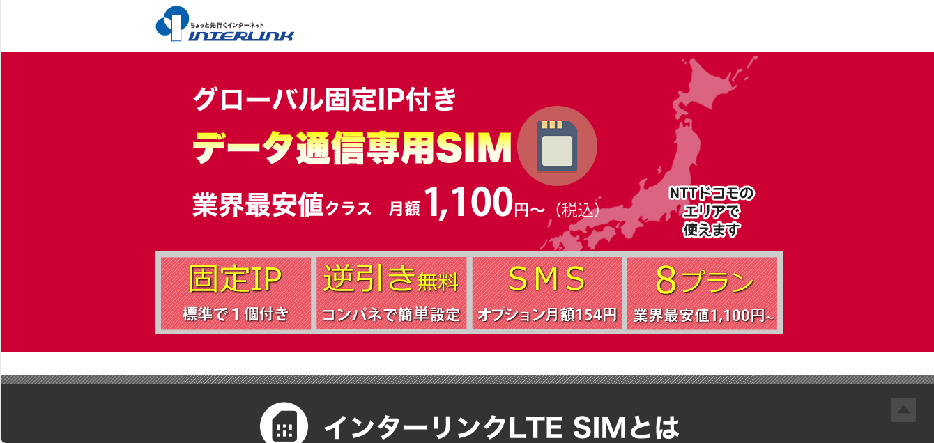 インターリンクLTE SIMは、固定IPアドレスを利用できる数少ないデータ通信専用SIMです。
