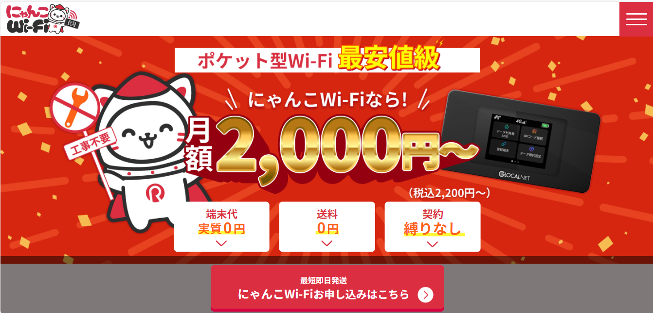 にゃんこWi-Fiは、契約期間の縛りがなく、月額2,200円から利用できる格安ポケットWiFiサービスです。