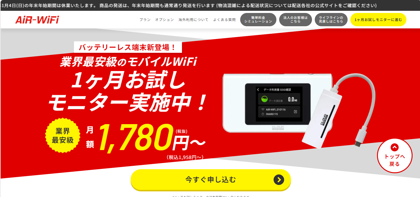 AiR-Wi-Fiは、低価格と柔軟な契約形態を両立させた、まさに現代のライフスタイルに合ったポケット型Wi-Fiサービスです。月額2,980円からという業界最安級の料金設定と、縛りなしオプションによる自由度の高さは、他社にはない大きな魅力となっています。