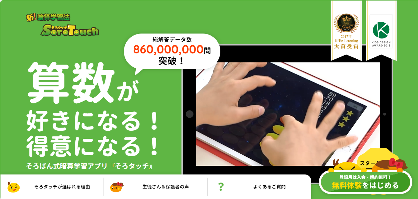 そろタッチは、iPadやiPhoneを使ってそろばん式暗算を習得できる画期的な学習アプリです。3歳~8歳推奨従来のそろばん教室のように教室に通う必要がなく、自宅で好きな時間に学習できることが大きな特徴です。ゲーム感覚で楽しみながら取り組めるように設計されており、子どもが自ら進んで学習する仕組みが整っています。すでに世界中で多くの子どもたちが利用し、驚異的な計算力を身につけている実績あるサービスです。