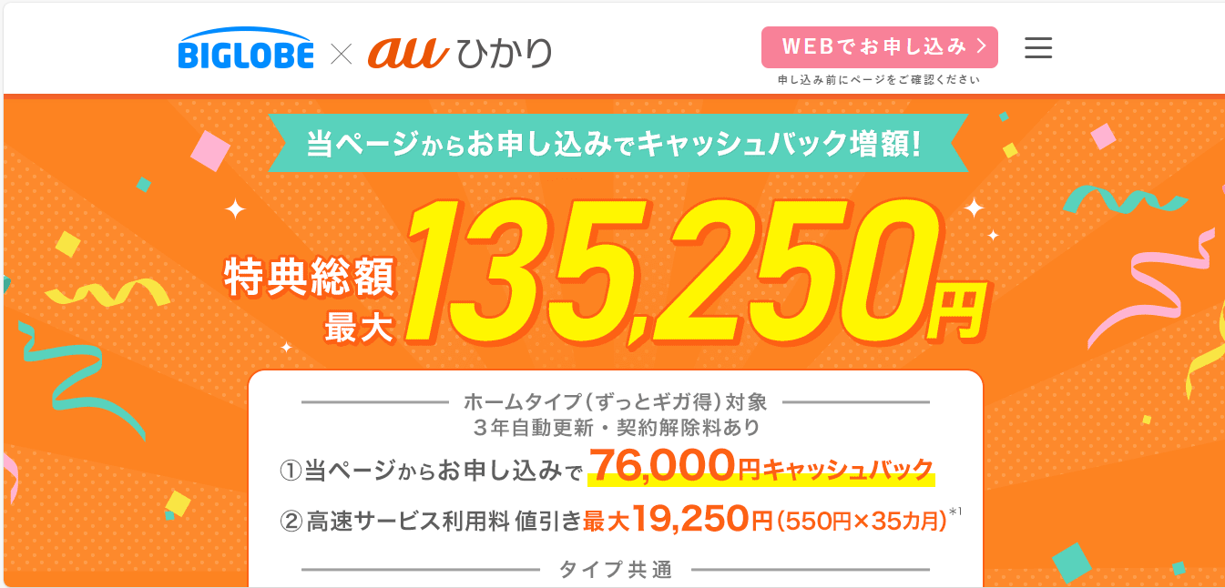 BIGLOBEからauひかりを申し込むと、高額キャッシュバックや工事費実質無料など、魅力的なキャンペーン特典が受けられます。キャンペーン内容は時期によって変わりますが、新規申込者には手厚い特典が用意されていることが多く、初期費用を大幅に抑えて光回線を始められます。他社からの乗り換えの場合、解約違約金を負担してくれる特典もあるため、安心して乗り換えができます。