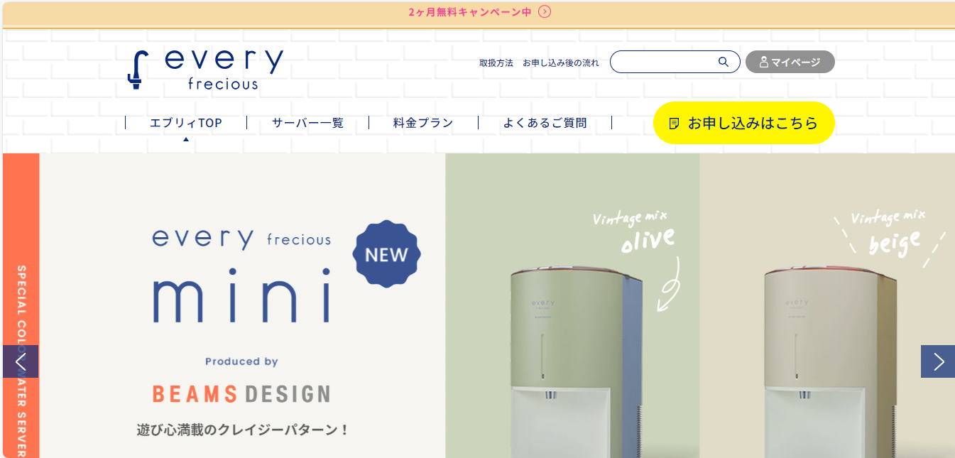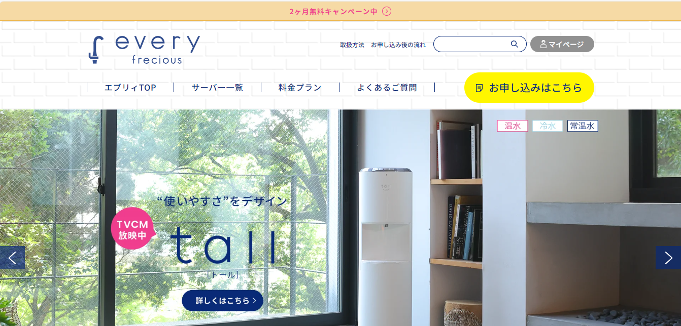 「every frecious(エブリィフレシャス)」は、浄水型でありながら使いやすさとデザイン性を兼ね備えたウォーターサーバーです。安全でおいしい水を自宅で手軽に楽しめるほか、冷水・温水の利用や省スペース設計、簡単なフィルター交換など、生活を快適にする機能が充実しています。経済的で環境にも優しいため、毎日の生活に取り入れやすいウォーターサーバーです。CM放映中の話題商品として、初めてウォーターサーバーを導入する方にもおすすめできます。
