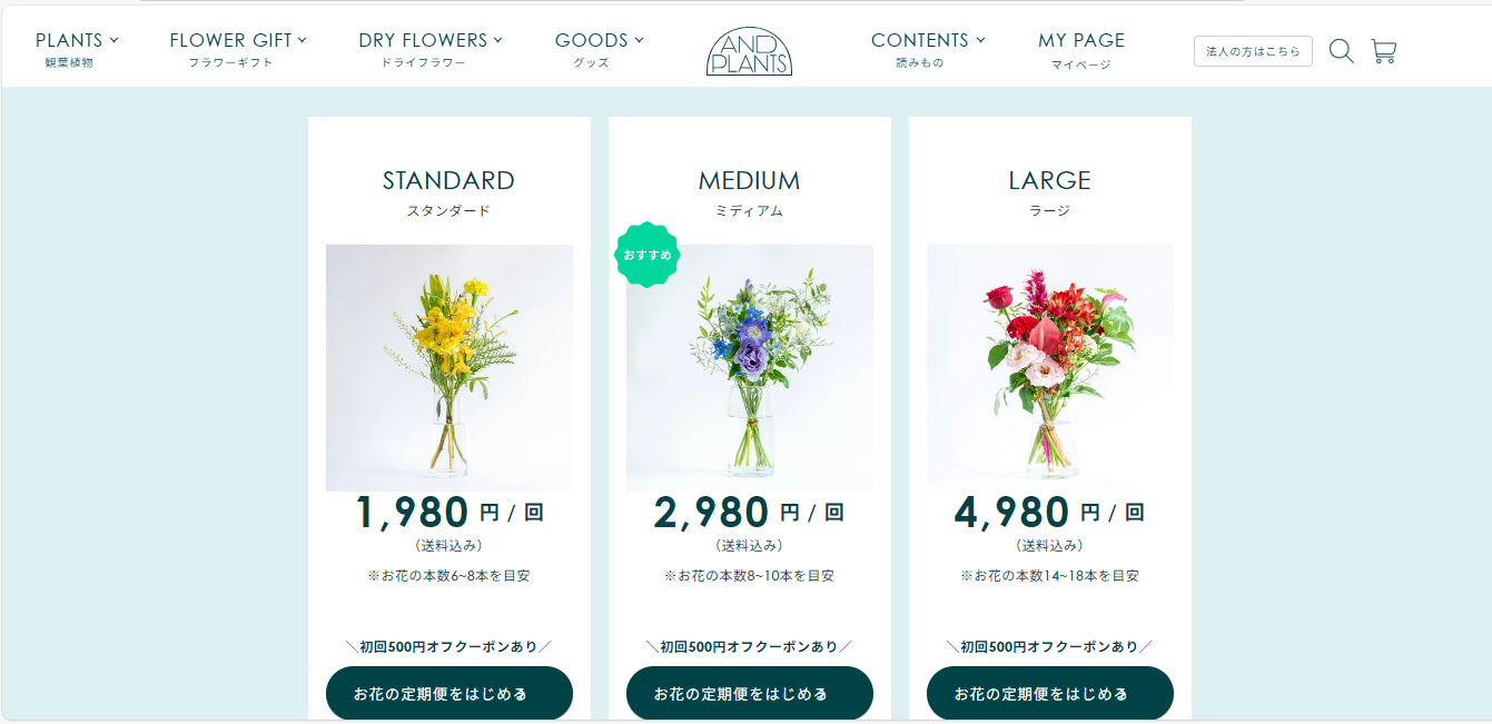 アンドプランツのお花の定期便は、プロが厳選した季節の花を自宅に定期的に届けてくれるサービスです。初回は500円オフで始められるため、花のある生活を気軽に試せる点も魅力です。