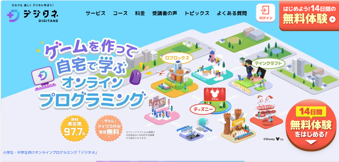 デジタネ(旧D-SCHOOLオンライン)は、小中学生に特化したオンラインプログラミングスクールです。最大の特徴は、マインクラフトやRobloxといった子どもたちが夢中になるゲームを教材として採用している点です。ただ遊ぶのではなく、これらのゲームの中でプログラミングを学ぶことで、お子様は自然と楽しみながらスキルを習得できます。「勉強している」という感覚ではなく、「好きなことをしている」という感覚で学べるため、継続率が非常に高くなっています。