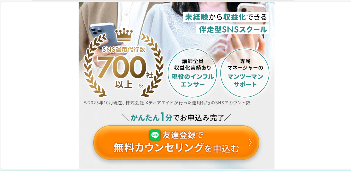 SONOMAMAは、SNS運用を本格的に学びたいすべての人に開かれたオンラインスクールです。無料カウンセリングから始められるため、リスクなく自分に合っているかを確認できます。実践的なカリキュラム、現役プロの講師陣、充実したサポート体制、活発なコミュニティにより、確実にスキルアップできる環境が整っています。SNSで影響力を持ちたい、収益化したい、ビジネスを成長させたいという目標をお持ちの方は、まずは無料カウンセリングに参加して、あなたの可能性を確かめてみてはいかがでしょうか。理想の発信力を手に入れる第一歩を、今日踏み出しましょう。