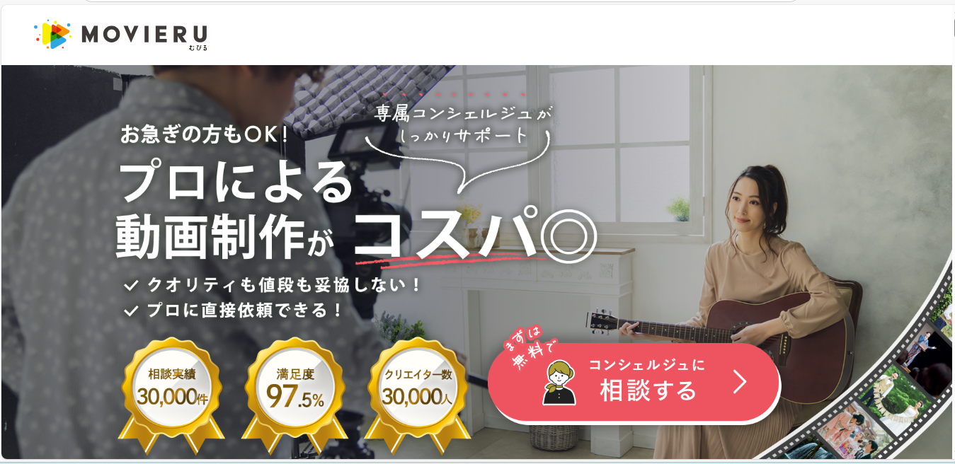 むびるは、動画制作を依頼したい企業や個人と、動画クリエイターをつなぐマッチングサービスです。動画広告、SNS動画、サービス紹介動画、採用動画など、さまざまな用途に対応できるクリエイターを探すことができます。無料相談を利用することで、動画制作が初めての方でも安心して検討を進められる点が特長です。