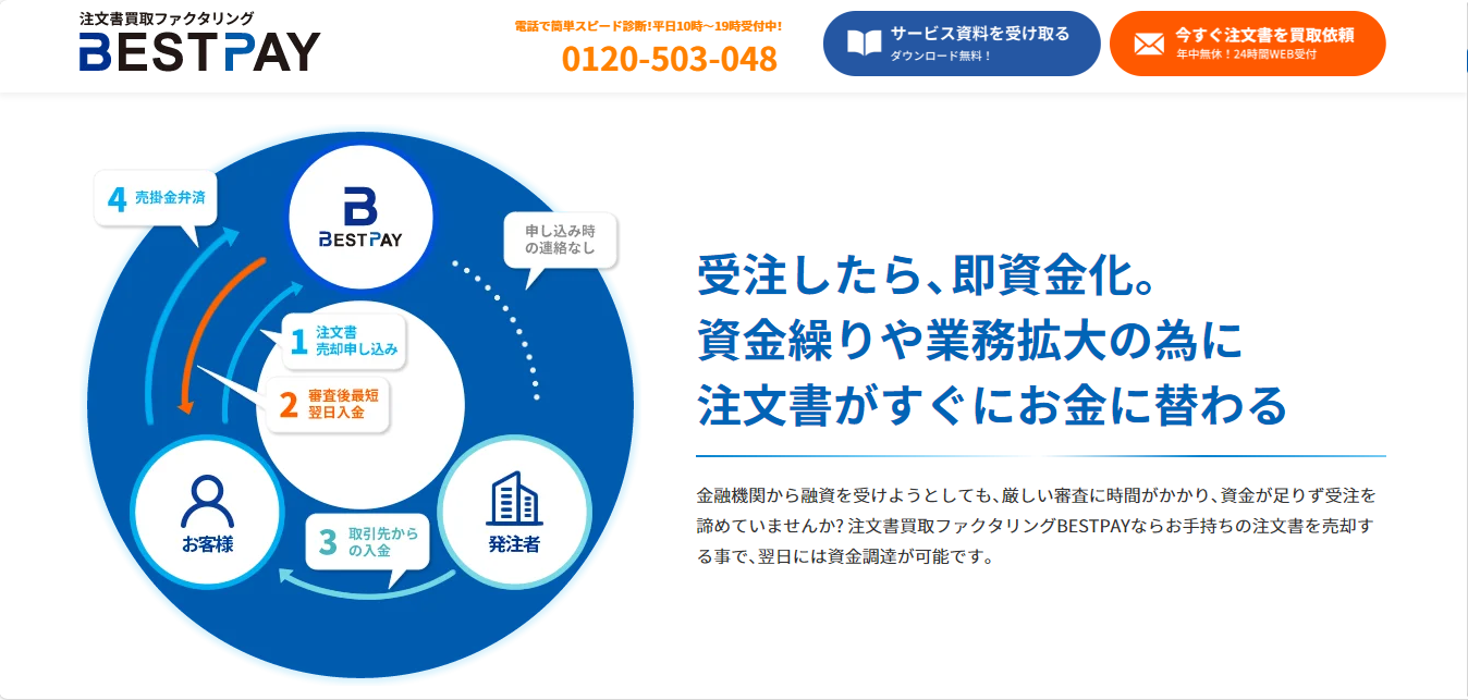 注文書買取ファクタリング「BestPay」は、受注が確定した段階の注文書をもとに資金化できるファクタリングサービスです。請求書発行前でも利用できる点が特徴で、資金繰りに課題を抱える企業や個人事業主にとって、柔軟な資金調達手段として注目されています。