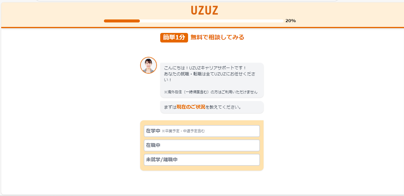 UZUZは、20代の第二新卒、既卒、フリーター、ニートの方を対象にした就職・転職エージェントです。新規無料会員登録を行うことで、専任のキャリアアドバイザーによるサポートを受けられ、就職や転職の成功率を高めることができます。