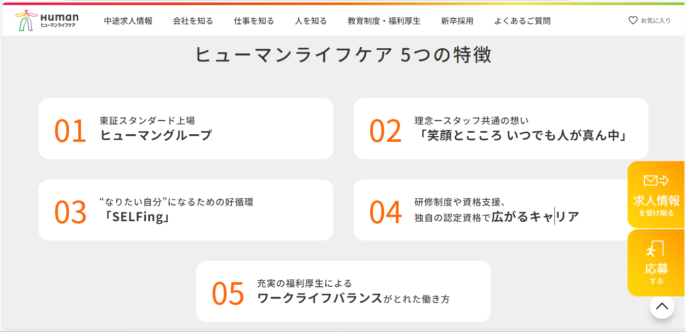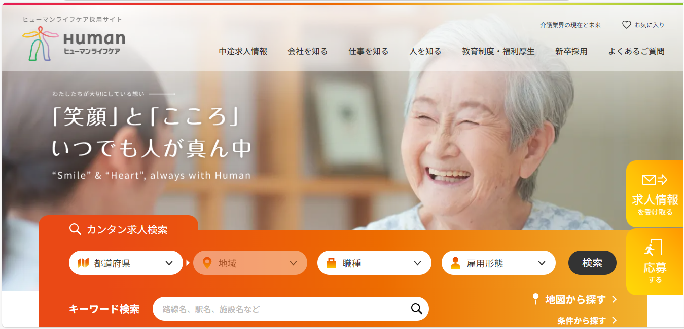 ヒューマンライフケアは、介護・福祉業界に特化した求人・採用支援サービスです。介護士、ケアマネージャー、介護職員など、幅広い職種の求人情報を提供しており、求職者が自身のスキルや希望条件に合った職場を見つけやすい環境を整えています。