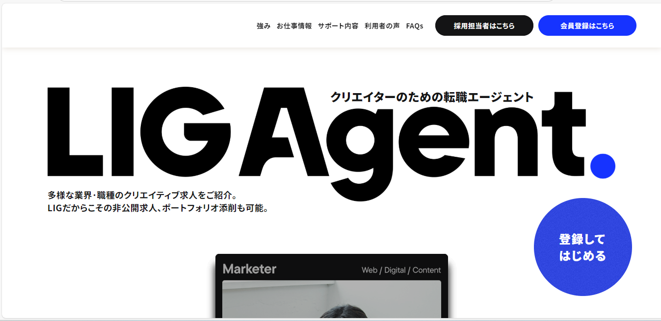 Webデザイナー、エンジニア、ディレクター、ライターなど、クリエイター職での転職を考えている方に注目されているのが「LIG Agent(LIGエージェント)」です。