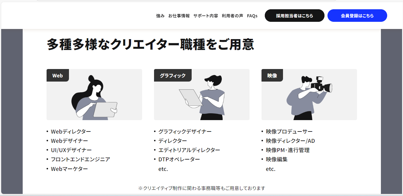 初めての転職はもちろん、キャリアの方向性に悩んでいる中堅・ベテランのクリエイターにもおすすめできるサービスです。