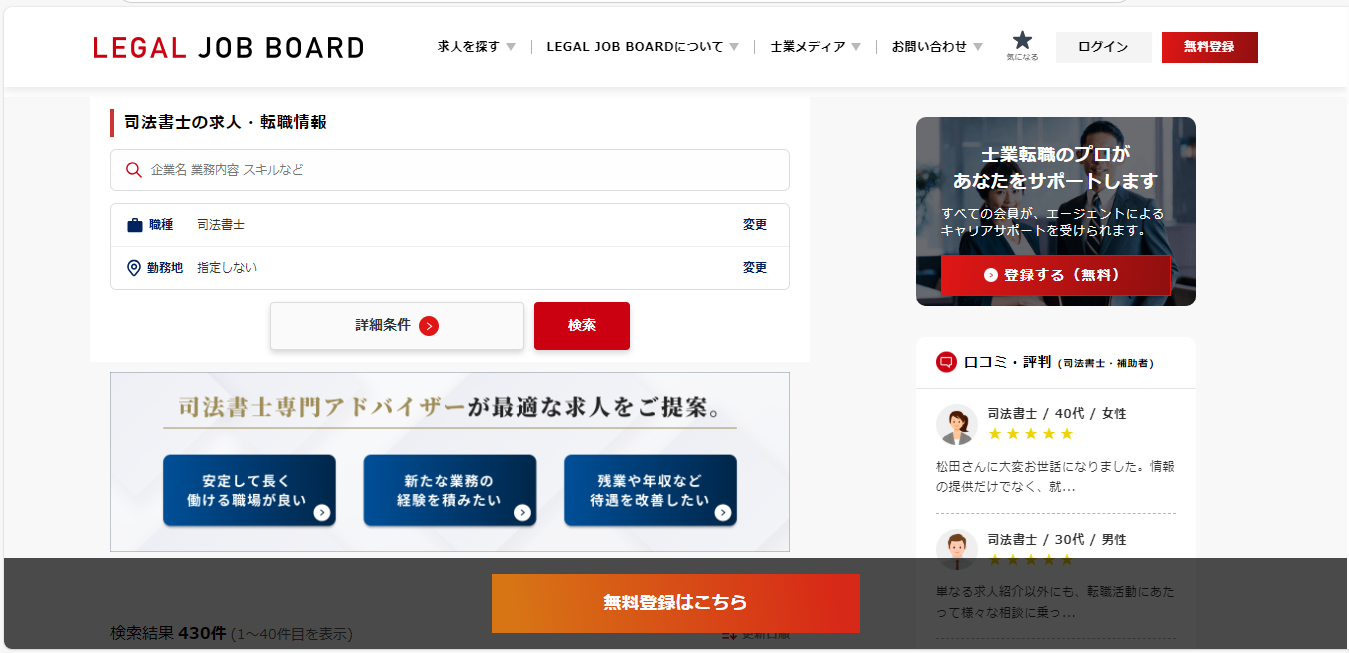 司法書士・司法書士補助者としてキャリアアップや転職を検討している方は、まずリーガルジョブボードに登録し、面談で希望条件を整理することをおすすめします。