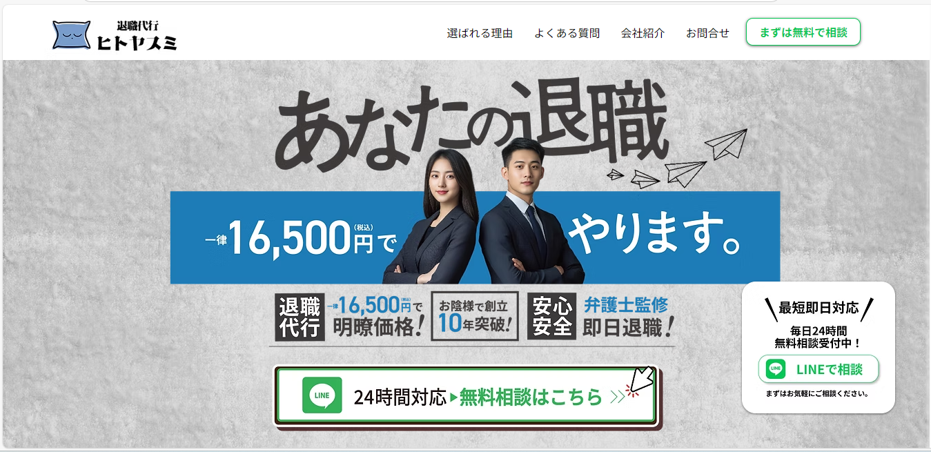 ヒトヤスミの退職代行サービスは、弁護士の監修のもと運営されています。そのため、労働基準法に基づいた正しい手続きを行うことができ、会社側からの不当な対応にも安心して対応できます。法律の専門家が関わっているため、トラブルのリスクを最小限に抑えられるのも大きな特徴です。