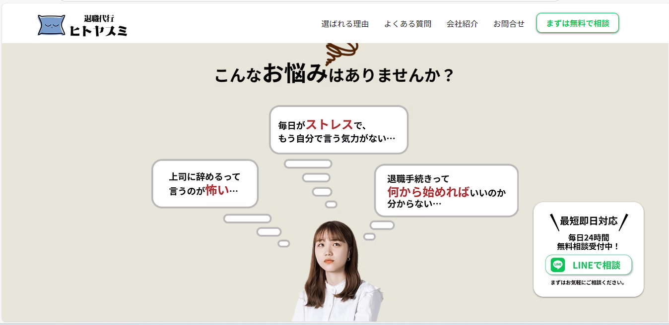 ヒトヤスミを利用することで、これまで不安だった退職のプロセスをスムーズに、安全に進めることができます。特に「精神的負担を減らしたい」「法律に基づいた安全な手続きをしたい」と考えている方には非常におすすめです。