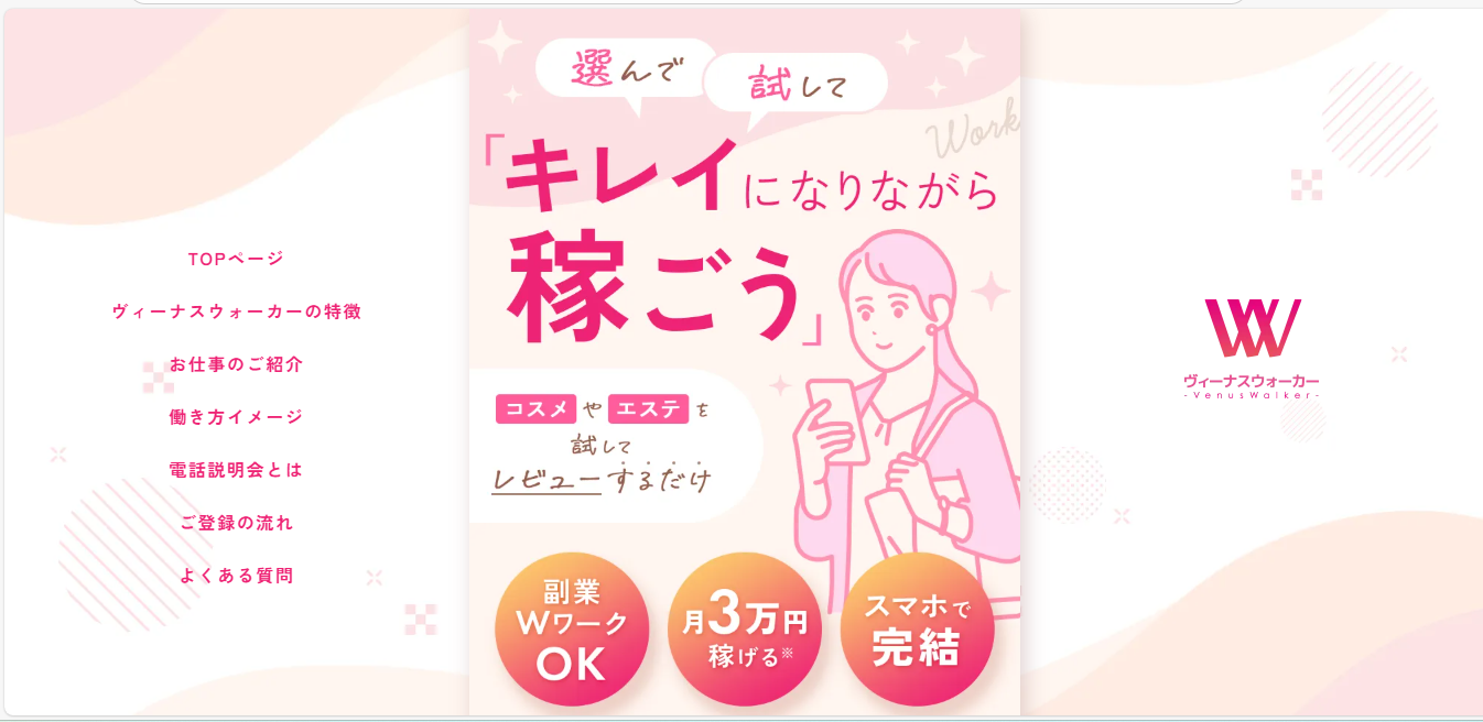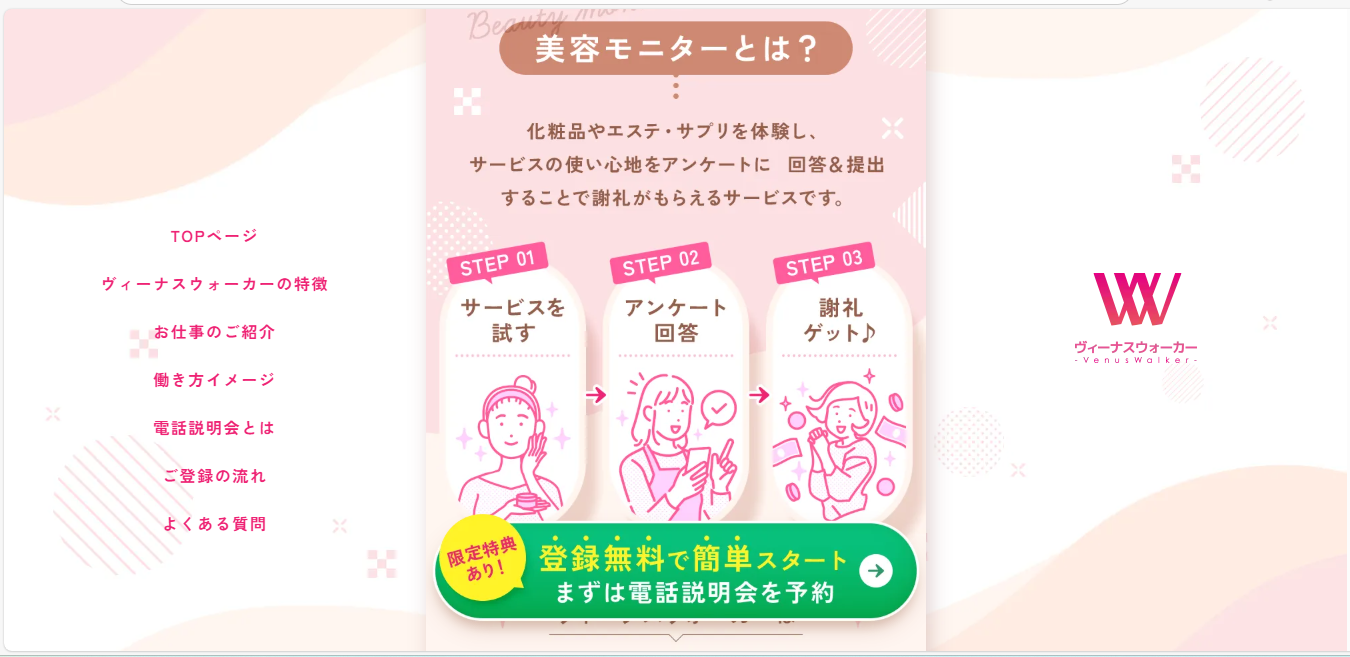 ヴィーナスウォーカーは、女性向けの商品やサービスを体験しながら報酬を得られる、女性専用のモニターサイトです。