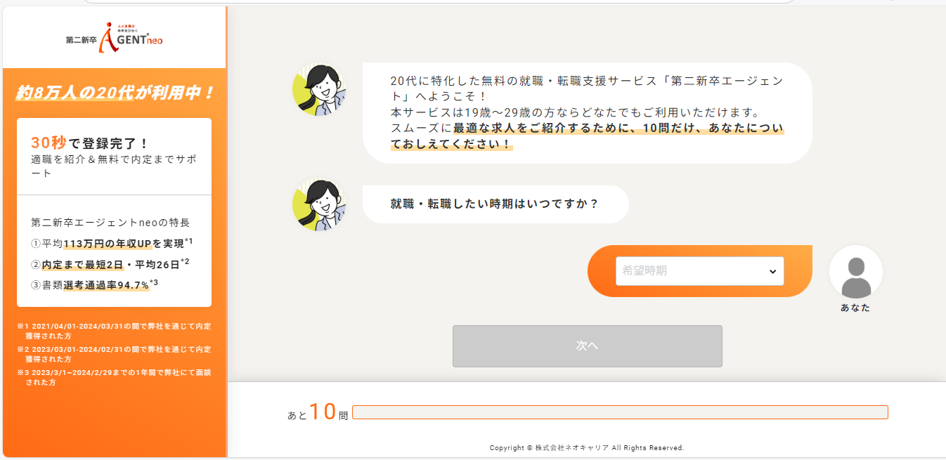 第二新卒エージェントneoは、若年層の就職・転職支援に特化したエージェントサービスです。書類作成から面接対策、企業紹介までを一貫してサポートし、すべて無料で利用できます。